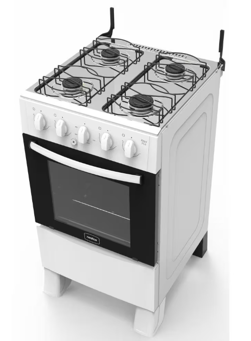 Trempe reforçada, arame 4 mm modelos, queimadores encaixados, bloqueando a entrada de resíduos, mesa totalmente selada com a trempe encaixada, sem furação de guia, acendimento automático, grade cromada, forno com tecnologia de esmaltação Cleartec, forno com 50 litros de capacidade.